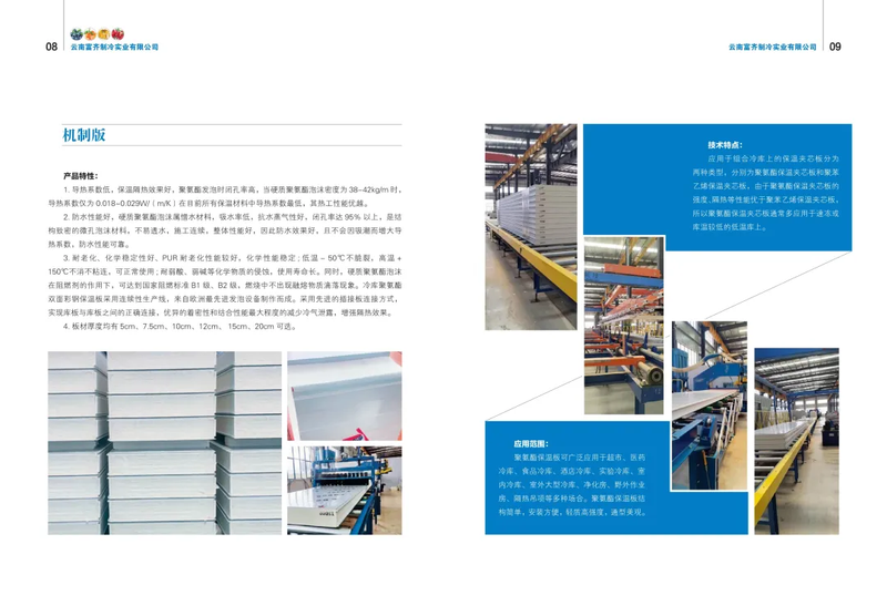机制板 产品特性: 1.导热系数低,保温隔热效果好,聚氨酯发泡时闭孔率高,当硬质聚氨酯泡沫密度为 38-42kg/m 时,导热系数仅为 0.018~0.029W/(m/)在目前所有保温材料中导热系数最低,其热工性能优越。 2.防水性能好,硬质聚氨酯泡沫属憎水材料,吸水率低,抗水蒸气性好,闭孔率达 95% 以上,是结构致密的微孔泡沫材料,不易透水,施工连续,整体性能好,因此防水效果好,且不会因吸潮而增大导热系数,防水性能可靠。 3.耐老化、化学稳定性好、PUR耐老化性能较好,化学性能稳定:低温-50℃不脆裂,高温+150℃不消不粘连,可正常使用;耐弱酸、弱碱等化学物质的侵蚀,使用寿命长。同时,硬质聚氨酯泡沫在阻燃剂的作用下,可达到国家阻燃标准 B1 级、B2级,燃烧中不出现融熔物质滴落现象。冷库聚氨酯双面彩钢保温板采用连续性生产线,来自欧洲最先进发泡设备制作而成。采用先进的插接板连接方式,实现库板与库板之间的正确连接,优异的着密性和结合性能最大程度的减少冷气泄露,增强隔热效果。4.板材厚度均有 5cm、7.5cm、10cm、12cm、15cm、20cm 可选。